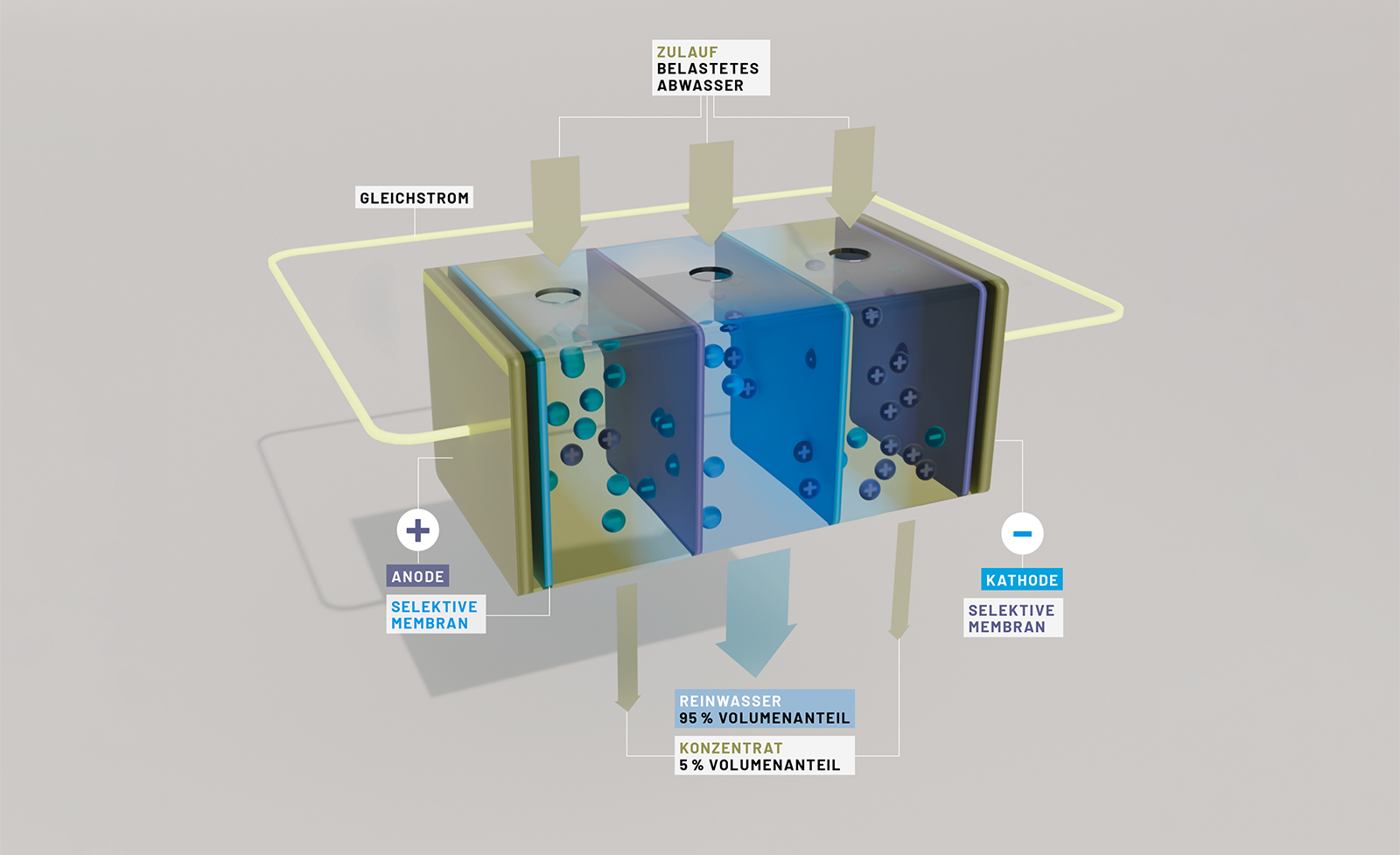 Prinzip: Elektrodialyse trennt gelöste Schadstoffe mithilfe von Gleichstrom und selektiven Membranen aus dem Reinigungswasser.